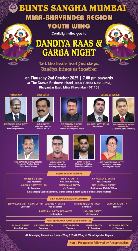 ಬಂಟರ ಸಂಘ ಮುಂಬಯಿ ಮೀರಾ ಭಯಂದರ್ ಪ್ರಾದೇಶಿಕ ಸಮಿತಿಯ ಕಾರ್ಯಾಧ್ಯಕ್ಷರಾದ ಗುತ್ತಿನಾರ್ ರವೀಂದ್ರ ಶೆಟ್ಟಿ ಕೊಟ್ರಪಾಡಿಯವರ ನೇತೃತ್ವದಲ್ಲಿ ಹಾಗೂ ಯುವ ವಿಭಾಗದ ಕಾರ್ಯಾಧ್ಯಕ್ಷ ವೃಷಭ್ ಶೆಟ್ಟಿಯವರ ಮುಂದಾಳತ್ವದಲ್ಲಿ ದಾಂಡಿಯಾ ರಾಸ್ ಹಾಗೂ ಗರ್ಬಾ ನೈಟ್ ಮತ್ತು ವಿವಿಧ ರೀತಿಯ ಕಾರ್ಯಕ್ರಮಗಳು ಇದೇ ಬರುವ ಅಕ್ಟೋಬರ್ 2 ರ ಗುರುವಾರದಂದು ಸಂಜೆ 7 ಗಂಟೆಯಿಂದ ಭಯಂದರ್ ಗೊಲ್ಡನ್ ನೆಸ್ಟ್ ಸರ್ಕಲ್ ಸಮೀಪದ ದಿ ಕ್ರೌನ್ ಬ್ಯುಸಿನೆಸ್ ಹೊಟೇಲ್ ಇಲ್ಲಿ ನಡೆಯಲಿದೆ. ಪ್ರಾದೇಶಿಕ ಸಮಿತಿಯ ಯುವ ವಿಭಾಗದ ವತಿಯಿಂದ ಅದ್ದೂರಿಯಿಂದ ನಡೆಯಲಿರುವ ಈ ಕಾರ್ಯಕ್ರಮದಲ್ಲಿ ಭಾಗವಹಿಸುವ 7 ವರ್ಷ ಕೆಳಗಿನ ವಯೋಮಿತಿಯ ಪುಟಾಣಿಗಳಿಗೆ ಆಕರ್ಷಕ ಬಹುಮಾನವನ್ನು ನೀಡಲಾಗುವುದು. ದಾಂಡಿಯಾ ರಾಸ್ ಹಾಗೂ ಗರ್ಬಾ ನೈಟ್ ನಲ್ಲಿ ಭಾಗವಹಿಸುವ ಪುರುಷ ಹಾಗೂ ಮಹಿಳೆಯರಿಗೆ ರಮಣೀಯವಾಗಿ ಧರಿಸುವ ಬಟ್ಟೆಗಳ ಆಧಾರದ ಮೇಲೆ ಪ್ರಥಮ, ದ್ವಿತೀಯ ಹಾಗೂ ತೃತೀಯ ಮತ್ತು ಪುರುಷ ಹಾಗೂ ಮಹಿಳಾ ವಿಭಾಗದ ನೃತ್ಯಗಾರರಿಗೆ ಪ್ರಥಮ, ದ್ವಿತೀಯ ಮತ್ತು ತೃತೀಯ ಪ್ರಾಶಸ್ತ್ಯದ ಬಹುಮಾನಗಳನ್ನು ನೀಡಿ ಪುರಸ್ಕರಿಸಲಾಗುವುದು.