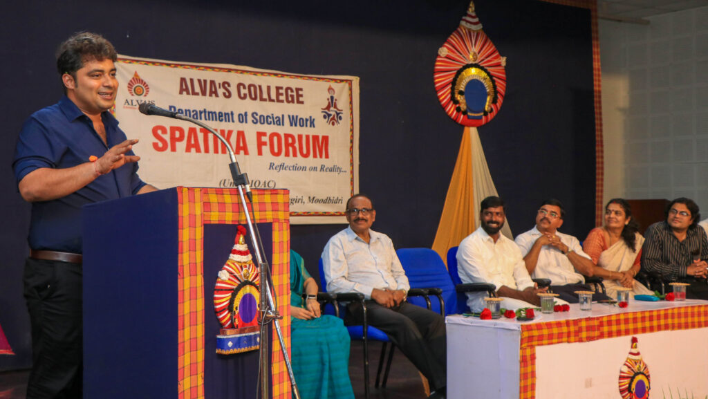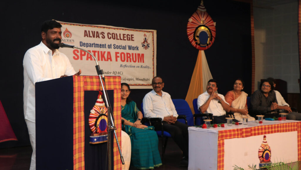 ಆಳ್ವಾಸ್ ಸಂಸ್ಥೆಯ ಟ್ರಸ್ಟಿ ವಿವೇಕ್ ಆಳ್ವ ಮಾತನಾಡಿ, ಸಮಾಜಕಾರ್ಯ ವಿಭಾಗದ ಮೂಲಕ ಸಮಾಜ ಸೇವೆಗೆ ಹೆಚ್ಚಿನ ಅವಕಾಶವಿದೆ. ವಿದ್ಯಾರ್ಥಿಗಳು ಈ ವೇದಿಕೆಯನ್ನು ಬಳಸಿಕೊಂಡು ಸಮಾಜಕ್ಕೆ ನೆರವು ನೀಡುವ ಕಾರ್ಯದಲ್ಲಿ ತೊಡಗಿಕೊಳ್ಳಬೇಕು ಎಂದರು. ಆಳ್ವಾಸ್ ಕಾಲೇಜಿನ ಪ್ರಾಂಶುಪಾಲ ಡಾ. ಕುರಿಯನ್ ಮಾತನಾಡಿ, ಸಮಸ್ಯೆಯ ಮೂಲವನ್ನು ಅರಿತು ಕಾರ್ಯಪ್ರವೃತ್ತರಾಗುವುದು ಈ ಕ್ಷೇತ್ರದ ಅಗತ್ಯ. ನಿಜವಾದ ಪರಿಣಾಮ ಕೇವಲ ಪ್ರಯತ್ನವನ್ನು ಮಾತ್ರ ಅವಲಂಬಿಸಿಲ್ಲ, ಕೈಗೊಂಡ ಕ್ರಿಯೆಗಳು ಅಗತ್ಯವಿರುವ ಸಮುದಾಯದ ಕಟ್ಟಕಡೆಯ ವ್ಯಕ್ತಿಗೆ ತಲುಪಿದಾಗ ಮಾತ್ರ ಬದಲಾವಣೆ ಸಾಧ್ಯ ಎಂದರು. ಸರಕಾರಿ ಪ್ರೌಢಶಾಲೆ ನಿರ್ಕರೆ ಹಾಗೂ ಎಡಪದವಿನ ಸ್ವಾಮಿ ವಿವೇಕಾನಂದ ಪದವಿಪೂರ್ವ ಕಾಲೇಜಿನ ವಿದ್ಯಾರ್ಥಿಗಳಿಗೆ, ಆಳ್ವಾಸ್ ಸಮಾಜಕಾರ್ಯ ವಿಭಾಗದ ಹಿರಿಯ ವಿದ್ಯಾರ್ಥಿ ಪ್ರಸ್ತುತ ಜಪಾನನಲ್ಲಿ ಉದ್ಯೋಗದಲ್ಲಿರುವ ಪುನೀತ ಕೊಡುಗೆ ನೀಡಿದ ನೋಟ್ಬುಕ್ಗಳನ್ನು ವಿತರಿಸಲಾಯಿತು. ಕಾರ್ಯಕ್ರಮದಲ್ಲಿ ಕಾಲೇಜಿನ ಆಡಳಿತಾಧಿಕಾರಿ ಬಾಲಕೃಷ್ಣ ಶೆಟ್ಟಿ, ಸಮಾಜಕಾರ್ಯ ವಿಭಾಗದ ಮುಖ್ಯಸ್ಥೆ ಡಾ. ಮಧುಮಾಲಾ ಕೆ., ಸ್ಪಟಿಕ ಫೋರಂ ಸಂಯೋಜಕ ಸುಧೀಂದ್ರ ಜೆ. ಶಾಂತಿ, ಸಂಯೋಜಕಿ ನಯೋಮಿ ರಿಯೋನಾ ಮೋರಾಸ್, ವೇದಿಕೆಯ ಸಂಯೋಜಕ ಅಬ್ದುಲ್ ರಹ್ಮಾನ್ ಮತ್ತು ಇನ್ಷಾ ಇದ್ದರು. ಸುರಕ್ಷಾ ಹಾಗೂ ಅರ್ಪಿತಾ ನಿರೂಪಿಸಿ, ಗಗನ ಶರ್ಮ ಸ್ವಾಗತಿಸಿ, ಅನನ್ಯ ಅತಿಥಿಯನ್ನು ಪರಿಚಯಿಸಿ, ಇನ್ಷಾ ವಂದಿಸಿದರು.