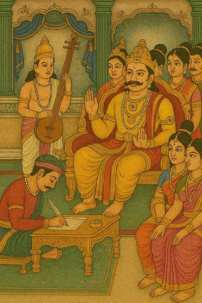 ಇಂದ್ರನ ಗೂರಾಟಿಕೆನ್ ಕೇಂದ್ ಅಲ್ಪ ನಾಲ್ ಮೆಯಿಟ್ ನಿರೆದಿನ ದೇವತೆಲೆನ ನಡ್ಡೆ ಇತಿನ ನಾರದೆರ್ ತೆಲಿತೊಂದು ತೆಲಿತೊಂದು ನುಡ್ಡಿಯೆರ್ “ಇಂದ್ರಾ, ಅರ್ಜುನೆ ಕಂಬೊಗೇ ನಾಟಡ್ ಪಂದ್ ಪಗರಿ ಬುಡುದು ನಿನ್ನ ಜೀವ ಒರ್ತೆ, ಆಯೆ ನಿಕ್ಕೇ ನಾಟಡ್ ಪಂದ್ ಪಗರಿ ಬುಡ್ತುವೆಡಾ, ಆ ಕನೆ ನಿಕ್ಕ್ ಪೋಡಿದ್, ನಿಕ್ಕ್ ಕಂತದೆ ಇತುದುವಾ? ಇಂದ್ರಾ, ನಿನ್ನ ಗರ್ವ ಅಂಚಿ ಇಪ್ಪಡ್, ಅರ್ಜುನೆ ದಾದ ಮಾತ ಕೇಂದೆನಾ, ಅವ್ವೆನ್ ಮಾತ ಕೊರ್ದು ಕಡಪುಡು”. ನಾರದೆರೆ ಮದಿಪು ಕೇಂಡಿ ಇಂದ್ರೆ, “ಉಂದು ದಾದೆ ನಾರದೆರೇ, ನರಮಾನಿ ಪಾತೆರೊಗ್ ಪೋಡಿದ್ ದೇವತೆಲು ನರಮಾನಿಗ್ ಕಾನಿಕೆ ಕೊರ್ತಿನೈವ್ವೆನ್ ಈರ್ ಓಲಾಂಡಲಾ ಕೇಂದರೆ? ನಾರದೆರೆ ಉಂದೆನ್ ಪನ್ಲೆ ನಾರದರೆ ಪನ್ಲೆ” ಪನ್ನಗ, ನಾರದೆರ್ “ದೇವತೆಲೆಡ್, ರಕ್ಕಸೆರೆಡ್, ನರಮಾನಿಲೆಡ್ ಅರ್ಜುನಗ್ ಪರಿಪಾಡುನ ಬೀರೆರ್ ಏರ್ ಲಾ ಇಜ್ಜೆರ್, ಆಯನ ಪಗರಿಲೆನ ಸಾಮರ್ತ್ಯ ದಾದ ಪಂದ್ ಪನ್ಪೆ, ಕೇನ್” ಪಂದ್ ನಾರದೆರ್ ಪನ್ಪೆರ್.