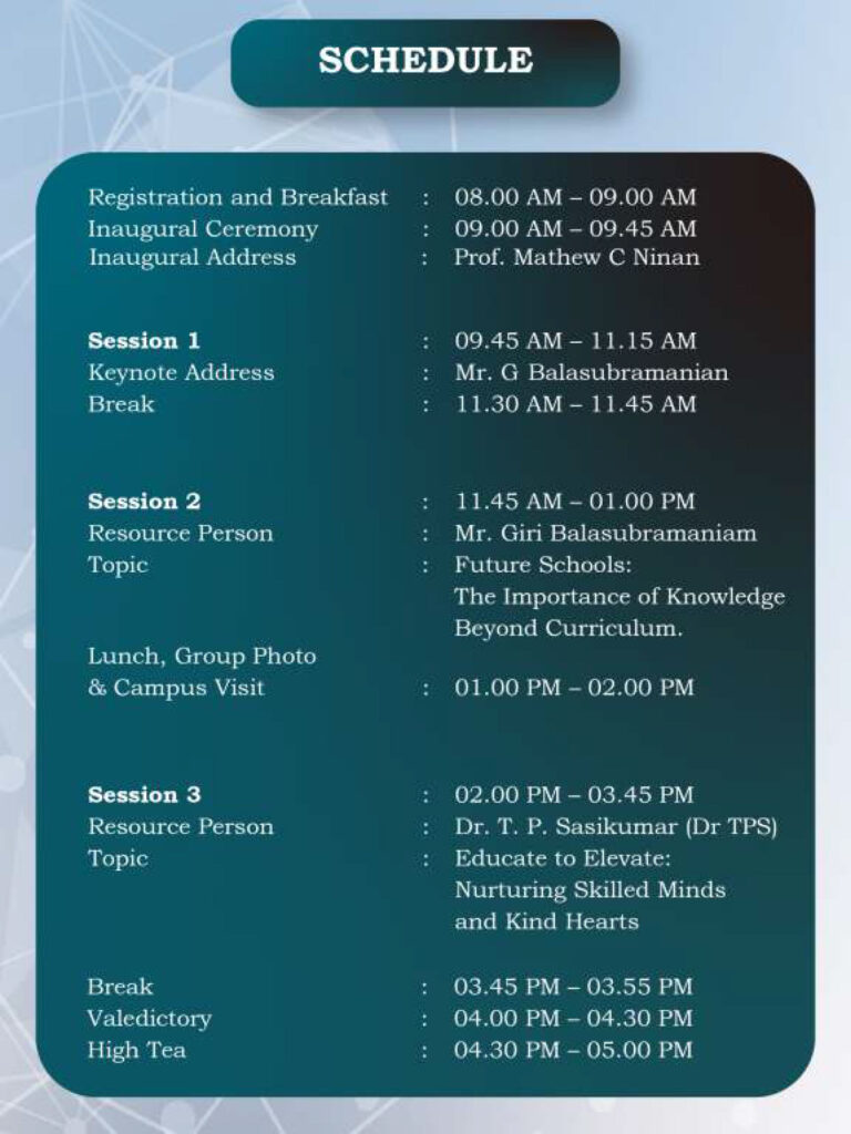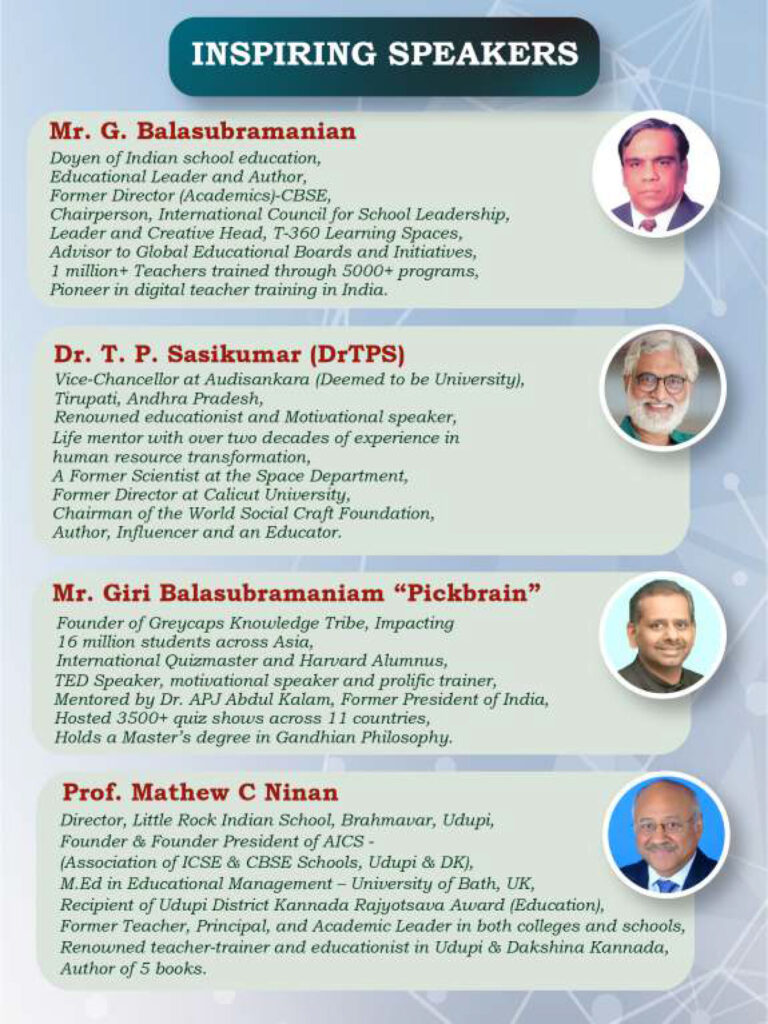 ಸಿಬಿಎಸ್ಇ ಮಾಜಿ ನಿರ್ದೇಶಕ ಜಿ ಬಾಲಸುಬ್ರಮಣಿಯನ್ ಮುಖ್ಯ ಸಂಪನ್ಮೂಲ ವ್ಯಕ್ತಿಯಾಗಿ ಆಗಮಿಸಲಿದ್ದು, ತಿರುಪತಿಯ ಆದಿಶಂಕರ ವಿಶ್ವವಿದ್ಯಾನಿಲಯದ ಉಪಕುಲಪತಿ ಡಾ. ಟಿ ಪಿ ಶಶಿಕುಮಾರ್ ‘ಎಜ್ಯುಕೇಟ್ ಟು ಎಲಿವೇಟ್’ (ಸಾಮರ್ಥ್ಯವುಳ್ಳ ಮನಸ್ಸುಗಳು ಮತ್ತು ಕರುಣಾಳು ಹೃದಯಗಳನ್ನು ಪೋಷಿಸುವುದು), ಅಂತಾರಾಷ್ಟ್ರೀಯ ಮಟ್ಟದ ಕ್ವಿಜ್ ಮಾಸ್ಟರ್ ಗ್ರೇ ಕ್ಯಾಪ್ಸ್ ಸಂಸ್ಥಾಪಕ ಶ್ರೀ ಗಿರಿ ಬಾಲಸುಬ್ರಮಣಿಯಮ್ ಪಿಕ್ಬ್ರೆöನ್ ‘ಫ್ಯೂಚರ್ ಸ್ಕೂಲ್ಸ್’ (ಪಠ್ಯಕ್ರಮದ ಹೊರತಾಗಿ ಜ್ಞಾನದ ಮಹತ್ವ) ಈ ವಿಷಯಗಳ ಕುರಿತು ಪ್ರಬಂಧ ಮಂಡಿಸಲಿದ್ದಾರೆ. ಉಭಯ ಜಿಲ್ಲೆಗಳ ೮೬ ಶಾಲೆಗಳು ನೋಂದಾಯಿಸಿಕೊoಡಿದ್ದು ಪ್ರತೀ ಶಾಲೆಯಿಂದ ಪ್ರಾಂಶುಪಾಲರು, ಉಪಪ್ರಾ0ಶುಪಾಲರು ಮತ್ತು ಶಿಕ್ಷಕರು ಭಾಗವಹಿಸಲಿದ್ದಾರೆ ಎಂದು ಜಿ ಎಮ್ ನ ಪ್ರಾಂಶುಪಾಲರಾದ ಜಾರ್ಜ್ ಕುರಿಯನ್ ಪತ್ರಿಕಾ ಪ್ರಕಟಣೆಯಲ್ಲಿ ತಿಳಿಸಿದರು.