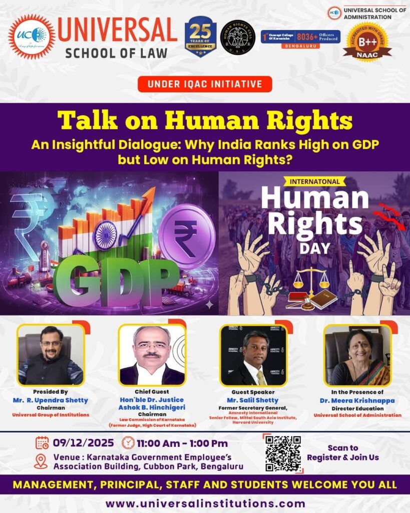 ಅಂತರಾಷ್ಟ್ರೀಯ ಮಾನವ ಹಕ್ಕುಗಳ ದಿನದ ಹಿನ್ನೆಲೆಯಲ್ಲಿ ಯುನಿವರ್ಸಲ್ ಗ್ರೂಪ್ ಆಫ್ ಇನ್ಸ್ಟಿಟ್ಯೂಷನ್ ವತಿಯಿಂದ ಮಾನವ ಹಕ್ಕುಗಳ ಕುರಿತು ವಿಶೇಷ ಉಪನ್ಯಾಸ, ಜಿಡಿಪಿಯಲ್ಲಿ ಭಾರತ ಮುಂದಿದ್ದರೂ ಮಾನವ ಹಕ್ಕುಗಳಲ್ಲಿ ಹಿಂದಿನ ಸ್ಥಾನ ಪಡೆಯಲು ಕಾರಣವೇನು? ಕುರಿತ ಸಂವಾದವನ್ನು ಡಿಸೆಂಬರ್ 9 ರಂದು ಬೆಳಗ್ಗೆ 11 ರಿಂದ ಮಧ್ಯಾಹ್ನ 1 ಗಂಟೆಯವರೆಗೆ ಕಬ್ಬನ್ ಪಾರ್ಕ್ ನಲ್ಲಿರುವ ಕರ್ನಾಟಕ ಸರ್ಕಾರಿ ನೌಕರರ ಸಂಘದ ಕಟ್ಟಡದಲ್ಲಿ ಹಮ್ಮಿಕೊಳ್ಳಲಾಗಿದೆ. ಕಾರ್ಯಕ್ರಮದ ಅಧ್ಯಕ್ಷತೆಯನ್ನು ಸಂಸ್ಥೆಯ ಅಧ್ಯಕ್ಷ ಯು.ಆರ್ ಉಪೇಂದ್ರ ಶೆಟ್ಟಿ ವಹಿಸಲ್ಲಿದ್ದಾರೆ. ಕರ್ನಾಟಕ ಕಾನೂನು ಆಯೋಗದ ಅಧ್ಯಕ್ಷ ನ್ಯಾಯಮೂರ್ತಿ ಡಾ. ಅಶೋಕ್ ಬಿ ಹಿಂಚಿಗೇರಿ ಉಪಸ್ಥಿತರಿರುವರು. ಅತಿಥಿ ವಕ್ತಾರರಾಗಿ ಅಮ್ನೆಸ್ಟಿ ಇಂಟರ್ನ್ಯಾಷನಲ್ ಸೀನಿಯರ್ ಫೆಲೋ, ಮಿತ್ತಲ್ ದಕ್ಷಿಣ ಏಷ್ಯಾ ಸಂಸ್ಥೆಯ ನಿವೃತ್ತ ಮಹಾ ಕಾರ್ಯದರ್ಶಿ ಅಮ್ನೆಸ್ಟಿ ಸಲೀಲ್ ಶೆಟ್ಟಿ ಪಾಲ್ಗೊಳ್ಳಲಿದ್ದಾರೆ. ಯುನಿವರ್ಸಲ್ ಸ್ಕೂಲ್ ಆಫ್ ಅಡ್ಮಿನಿಸ್ಟ್ರೇಷನ್ ನಿರ್ದೇಶಕಿ ಡಾ| ಮೀರಾ ಕೃಷ್ಣಪ್ಪ ಉಪಸ್ಥಿತರಿರುವರು.