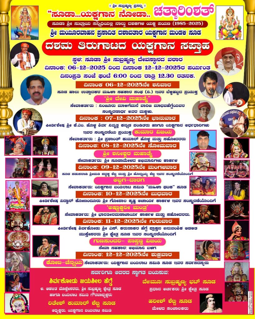 ಸಪ್ತಾಹದ ಅಂಗವಾಗಿ ತಿರುಗಾಟದ ಮೊದಲ ಪ್ರದರ್ಶನ ನಿಂಜೂರು ಮಾಳಿಗೆ ಮನೆ ಮಾಧವ ಹೆಗ್ಡೆ ಸ್ಮರಣಾರ್ಥ ಮಕ್ಕಳಿಂದ ‘ಶ್ರೀ ದೇವಿ ಮಹಾತ್ಮೆ’ ಯಕ್ಷಗಾನ ಬಯಲಾಟ ನಡೆಯಿತು. ನವೆಂಬರ್ 12ರ ವರೆಗೆ ಶ್ರೀ ಸುಬ್ರಹ್ಮಣ್ಯ ದೇವಸ್ಥಾನ ವಠಾರದಲ್ಲಿ ಸೂಡ ಶ್ರೀ ಮಯೂರ ವಾಹನ ಪ್ರಸಾದಿತ ದಶಾವತಾರ ಯಕ್ಷಗಾನ ಮಂಡಳಿಯಿಂದ ವಿವಿಧ ಪ್ರಸಂಗಗಳ ಬಯಲಾಟ ನಡೆಯಲಿದೆ.