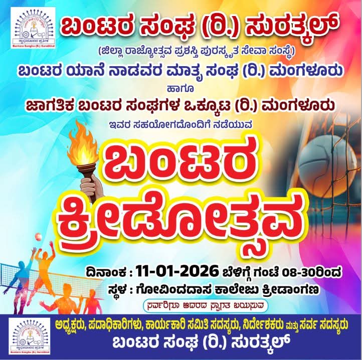 ಬಂಟರ ಸಂಘ (ರಿ) ಸುರತ್ಕಲ್ ಇದರ ಆಶ್ರಯದಲ್ಲಿ ಬಂಟರ ಯಾನೆ ನಾಡವರ ಮಾತೃ ಸಂಘ (ರಿ) ಮಂಗಳೂರು ಮತ್ತು ಜಾಗತಿಕ ಬಂಟರ ಸಂಘಗಳ ಒಕ್ಕೂಟ (ರಿ) ಮಂಗಳೂರು ಇವರ ಸಹಯೋಗದಲ್ಲಿ ಬಂಟರ ಕ್ರೀಡೋತ್ಸವ ಜನವರಿ 11 ರಂದು ಭಾನುವಾರ ಸುರತ್ಕಲ್ ಗೋವಿಂದ ದಾಸ ಕಾಲೇಜು ಮೈದಾನದಲ್ಲಿ ನಡೆಯಲಿದೆ. ಅಂದು ಬೆಳಿಗ್ಗೆ 8.30 ಕ್ಕೆ ನಡೆಯುವ ಬಂಟರ ಕ್ರೀಡೋತ್ಸವ ಕಾರ್ಯಕ್ರಮವನ್ನು ಬಂಟರ ಯಾನೆ ನಾಡವರ ಮಾತೃ ಸಂಘದ ಮಂಗಳೂರು ತಾಲೂಕು ಸಮಿತಿಯ ಸಂಚಾಲಕರಾದ ವಸಂತ ಶೆಟ್ಟಿ ಉದ್ಘಾಟಿಸಲಿದ್ದಾರೆ. ಅಧ್ಯಕ್ಷತೆಯನ್ನು ಸಂಘದ ಅಧ್ಯಕ್ಷರಾದ ಬಾಳ ಜಗನ್ನಾಥ ಶೆಟ್ಟಿ ವಹಿಸಲಿದ್ದಾರೆ. ಮುಖ್ಯ ಅತಿಥಿಗಳಾಗಿ ಎಕ್ಕಾರು ಬಂಟರ ಸಂಘದ ಅಧ್ಯಕ್ಷರಾದ ರತ್ನಾಕರ ಶೆಟ್ಟಿ ಎಕ್ಕಾರು, ಉದ್ಯಮಿ ಹರೀಶ್ ಶೆಟ್ಟಿ ಪೆರ್ಮುದೆ, ಮಂಗಳೂರು ಯಥಾಥ್೯ ಸೋಶಿಯಲ್ ನ ಈಶ್ವರ್ ಪ್ರಸಾದ್ ಶೆಟ್ಟಿ ಭಾಗವಹಿಸಲಿದ್ದಾರೆ. ಸಂಘದ ಸ್ಥಾಪಕಾಧ್ಯಕ್ಷ ರೋಹಿತಾಕ್ಷ ರೈ ಕುಳಾಯಿಗುತ್ತು ಉಪಸ್ಥಿತರಿರುವರು. ಮಧ್ಯಾಹ್ನ 12 ಗಂಟೆಗೆ ನಡೆಯುವ ಅಭಿನಂದನಾ ಸಮಾರಂಭದಲ್ಲಿ 2025 ರ ಸಾಲಿನ ರಾಜ್ಯೋತ್ಸವ ಪ್ರಶಸ್ತಿ ಪುರಸ್ಕೃತರಾದ ಮುಂಬಯಿ ಬಂಟರ ಸಂಘದ ಮಾಜಿ ಅಧ್ಯಕ್ಷ ಡಾ. ಪಿ ವಿ ಶೆಟ್ಟಿ ಮುಂಬೈ ಅವರಿಗೆ ಗೌರವ ಸನ್ಮಾನ ನಡೆಯಲಿದೆ.
