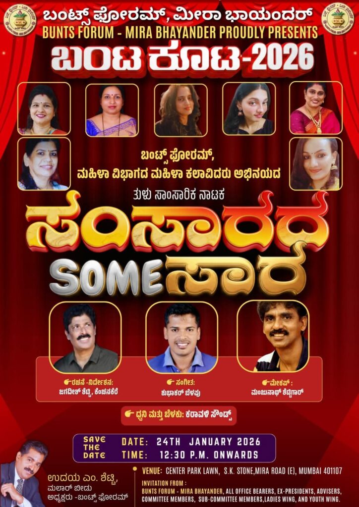 ಬಂಟ್ಸ್ ಫೋರಮ್ ಮೀರಾ ಭಾಯಂದರ್ ಜನವರಿ 24 ರಂದು ಉದಯ್ ಎಂ ಶೆಟ್ಟಿ ಮಲಾರಬೀಡು ಅವರ ಅಧ್ಯಕ್ಷತೆಯಲ್ಲಿ ಬಂಟ ಕೂಟ – 2026 ಕಾರ್ಯಕ್ರಮವು ಮೀರಾ ರೋಡ್ ಪೂರ್ವದ ಎಸ್ ಕೆ ಸ್ಟೋನ್ ಸಮೀಪ ಸೆಂಟ್ರಲ್ ಪಾರ್ಕ್ ಎಸಿ ಲಾನ್ ನಲ್ಲಿ ವಿವಿಧ ಕಾರ್ಯಕ್ರಮಗಳೊಂದಿಗೆ ಡಾ| ಆರ್ ಕೆ ಶೆಟ್ಟಿ ವೇದಿಕೆಯಲ್ಲಿ ಮದ್ಯಾಹ್ನ 12:00 ರಿಂದ ರಾತ್ರಿ 9:00ರ ತನಕ ನಡೆಯಲಿದೆ. ಮೀರಾಗಾಂವ್ ಶ್ರೀ ಮಹಾಲಿಂಗೇಶ್ವರ ದೇವಸ್ಥಾನದ ಪ್ರಧಾನ ಅರ್ಚಕ ಸಾಣೂರು ಸಾಂತಿಂಜ ಜನಾರ್ಧನ ಭಟ್ ಅವರು ದೀಪ ಪ್ರಜ್ವಲಿಸಿ ಕಾರ್ಯಕ್ರಮಕ್ಕೆ ಚಾಲನೆ ನೀಡಲಿರುವರು. ಮುಖ್ಯ ಅತಿಥಿಗಳಾಗಿ ಬಂಟರ ಸಂಘ ಮುಂಬಯಿಯ ಮೀರಾ ಭಾಯಂದರ್ ಪ್ರಾದೇಶಿಕ ಸಮಿತಿಯ ಕಾರ್ಯಾಧ್ಯಕ್ಷ ಗುತ್ತಿನಾರ್ ರವೀಂದ್ರ ಶೆಟ್ಟಿ ಬಳ್ಕುಂಜೆ ಗುತ್ತು, ಸಾಯಿಬಾಬಾ ಆಸ್ಪತ್ರೆಯ ಸಿಎಂಡಿ ನಿಂಜೂರು ಅಂಬರೀಶ್ ಹೆಗ್ಡೆ, ಮೀರಾ ಭಾಯಂದರ್ ಹೋಟೆಲ್ಸ್ ಅಸೋಸಿಯೇಷನ್ ನ ಅಧ್ಯಕ್ಷ ರಂಜನ್ ಶೆಟ್ಟಿ ಆಗಮಿಸಲಿರುವರು.