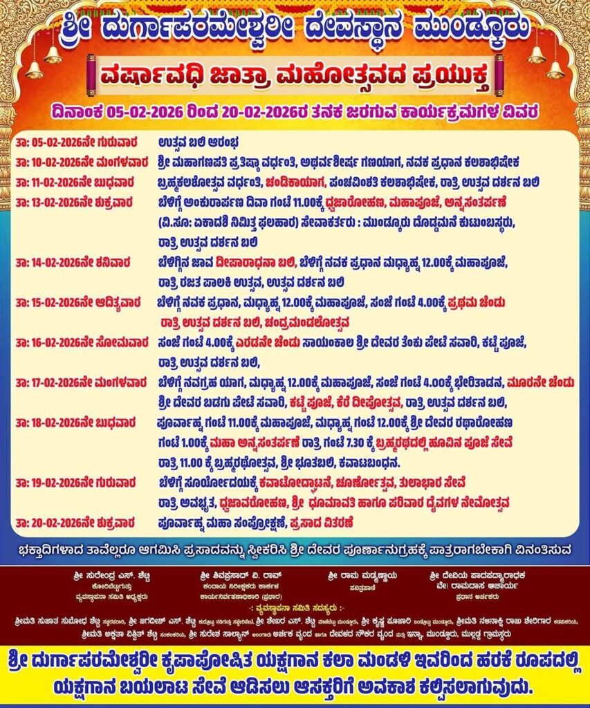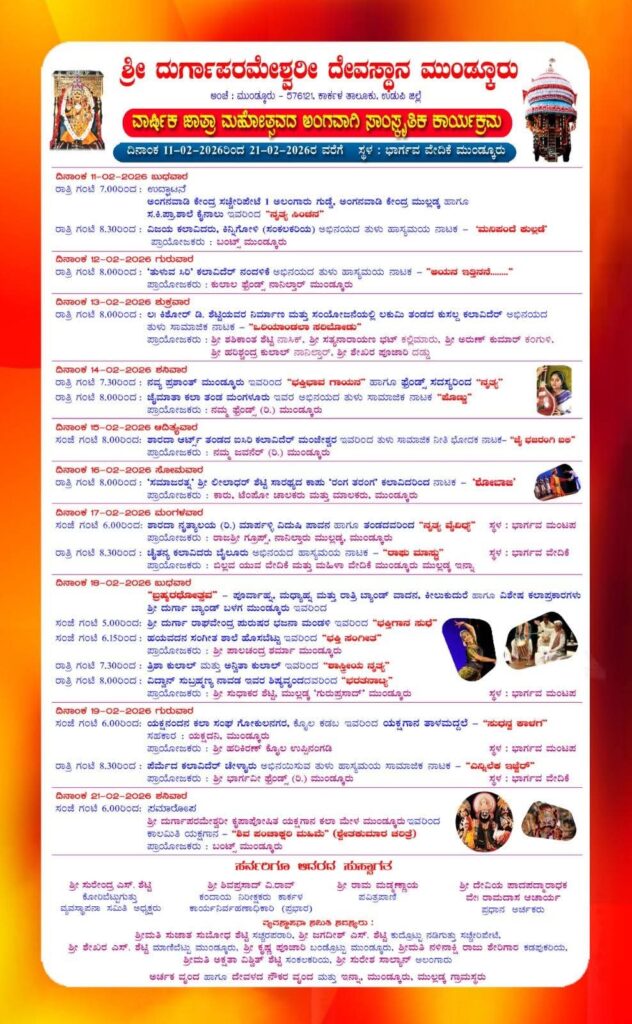 ಉಡುಪಿ ಜಿಲ್ಲೆಯ ಕಾರ್ಕಳ ತಾಲೂಕಿನ ಮುಂಡ್ಕೂರು ಗ್ರಾಮದ ಇತಿಹಾಸ ಪ್ರಸಿದ್ಧ ಮುಂಡ್ಕೂರು ಶ್ರೀ ದುರ್ಗಾಪರಮೇಶ್ವರಿ ಕ್ಷೇತ್ರದಲ್ಲಿ ವರ್ಷಾವಧಿ ಮಹೋತ್ಸವವು ಫೆಬ್ರವರಿ 13 ರಂದು ಧ್ವಜಾರೋಹಣಗೊಂಡು, ಫೆಬ್ರವರಿ 18 ರಂದು ಬ್ರಹ್ಮರಥೋತ್ಸವವು ಊರ ಪರ ಊರ ಭಕ್ತರ ಉಪಸ್ಥಿತಿಯಲ್ಲಿ ವಿಜೃಂಭಣೆಯಿಂದ ಜರಗಲಿದೆ. ಧಾರ್ಮಿಕ ಕಾರ್ಯಕ್ರಮದ ಅಂಗವಾಗಿ ಫೆಬ್ರವರಿ 5 ಗುರುವಾರ ಉತ್ಸವ ಬಲಿ ಆರಂಭಗೊಂಡು ಫೆಬ್ರವರಿ 10 ಮಂಗಳವಾರ ಶ್ರೀ ಮಹಾಗಣಪತಿ ಪ್ರತಿಷ್ಠ ವರ್ಧಂತಿ, ಅಥರ್ವ ಶಿರ್ಷಗಣಯಾಗ, ನವಕ ಪ್ರಧಾನ, ಕಳಶಾಭಿಷೇಕ ಜರಗಲಿದೆ. ಫೆಬ್ರವರಿ 11 ಬುಧವಾರ ಬ್ರಹ್ಮಕಲಶ ವರ್ಧಂತಿ, ಮಹಾಚಂಡಿಕಾಯಾಗ, ಪಂಚ ವಿoಶತಿ ಕಲಶಾಭಿಷೇಕ, ರಾತ್ರಿ ಉತ್ಸವ ಬಲಿ ನಡೆಯಲಿದೆ. ಫೆಬ್ರವರಿ 13 ಶುಕ್ರವಾರ ಬೆಳಿಗ್ಗೆ ಅಂಕುರಾರ್ಪಣ ಪೂರ್ವಾಹ್ನ ಗಂಟೆ 11ಕ್ಕೆ ಧ್ವಜಾರೋಹಣಗೊಂಡು ಮಹಾಪೂಜೆಯಾಗಿ ಸಾರ್ವಜನಿಕ ಅನ್ನ ಸಂತರ್ಪಣೆ ಜರಗುವುದಲ್ಲದೇ ರಾತ್ರಿ ಉತ್ಸವ ದರ್ಶನ ಬಲಿ ಜರಗುವುದು. ಫೆಬ್ರವರಿ 14 ಶನಿವಾರ ಬೆಳಗಿನ ಜಾವ ದೀಪಾರಾಧನಾ ಬಲಿ, ಬೆಳಿಗ್ಗೆ ನವಕ ಪ್ರಧಾನ, ಮಧ್ಯಾಹ್ನ 12ಕ್ಕೆ ಮಹಾಪೂಜೆ, ರಾತ್ರಿ ರಜತ ಪಾಲಕಿ ಉತ್ಸವ ನಡೆದು, ಉತ್ಸವ ದರ್ಶನ ಬಲಿ ಜರಗುವುದು. ಫೆಬ್ರವರಿ 15 ರವಿವಾರ ಬೆಳಿಗ್ಗೆ ನವಕ ಪ್ರಧಾನ ಮಧ್ಯಾಹ್ನ 12ಕ್ಕೆ ಮಹಾಪೂಜೆ ರಾತ್ರಿ ಉತ್ಸವ ದರ್ಶನ ಬಲಿ ಚಂದ್ರಮಂಡಲೋತ್ಸವ ಜರಗುವುದು. ಫೆಬ್ರವರಿ 16 ಸೋಮವಾರ ಸಾಯಂಕಾಲ ಶ್ರೀದೇವರ ತೆಂಕುಪೇಟೆ ಸವಾರಿ, ಕಟ್ಟೆ ಪೂಜೆ, ರಾತ್ರಿ ಉತ್ಸವ ದರ್ಶನ ಬಲಿ ಜರಗುವುದು. ಫೆಬ್ರವರಿ 17 ಮಂಗಳವಾರ ಬೆಳಿಗ್ಗೆ ನವಗ್ರಹ ಯಾಗ, ಮಧ್ಯಾಹ್ನ 12ಕ್ಕೆ ಮಹಾಪೂಜೆ, ಸಾಯಂಕಾಲ ಬೇರಿತಾಡನ, ಸಂಜೆ ಶ್ರೀದೇವರ ಬಡಗುಪೇಟೆ ಸವಾರಿ, ಕಟ್ಟೆ ಪೂಜೆ, ದೇವಸ್ಥಾನದ ಹಿಂದುಗಡೆಯ ಕೆರೆ ದೀಪೋತ್ಸವ, ರಾತ್ರಿ ಉತ್ಸವ ದರ್ಶನ ಬಲಿ ಜರಗುವುದು. ಫೆಬ್ರವರಿ 18 ಬುಧವಾರ ಪೂರ್ವಾಹ್ನ ಗಂಟೆ 11ಕ್ಕೆ ಮಹಾಪೂಜೆ, ಮಧ್ಯಾಹ್ನ ಗಂಟೆ 12ಕ್ಕೆ ದೇವಳದ ಮುಂಭಾಗ ದೇವರ ಬಲಿದರ್ಶನ ನಡೆದು ಶ್ರೀ ದುರ್ಗಾಪರಮೇಶ್ವರಿ ಅಮ್ಮನವರ ರಥಾರೋಹಣ ನಡೆಯುವುದು. ಗಂಟೆ 1 ರಿಂದ ಮಹಾ ಅನ್ನ ಸಂತರ್ಪಣೆ ಜರಗುವುದು. ರಾತ್ರಿ 7:30 ರಿಂದ ಬ್ರಹ್ಮರಥದಲ್ಲಿ ಅಸಂಖ್ಯಾತ ಹೂವಿನ ಪೂಜೆಗಳು ಜರಗಿ ರಾತ್ರಿ 11 ರಿಂದ ಬ್ರಹ್ಮರಥೋತ್ಸವ ಆರಂಭಗೊಂಡು ದೇವಳಕ್ಕೆ ಒಂದು ಸುತ್ತು ಪ್ರದಕ್ಷಿಣೆ ಬಂದು ಪಟಾಕಿ ಸುಡು ಮದ್ದುಗಳನ್ನು ಸುಡಲಾಗುವುದು. ತದನಂತರ ಬಲಿ ದರ್ಶನ ನಡೆದು ಶ್ರೀ ಭೂತಬಲಿ, ಕವಾಟ ಬಂಧನ ನಡೆಯುವುದು, ಫೆಬ್ರವರಿ 19 ಗುರುವಾರ ಬೆಳಿಗ್ಗೆ ಸೂರ್ಯೋದಯಕ್ಕೆ ಕವಾಟ ಉದ್ಘಾಟನೆ, ಚೂರ್ಣೋತ್ಸವ, ತುಲಾಭಾರ ಸೇವೆ, ರಾತ್ರಿ ಜಳಕ, ಅವಬ್ರತ, ಧ್ವಜ ಅವರೋಹಣ ನಡೆದು ಧೂಮಾವತಿ ಹಾಗೂ ಪರಿವಾರ ದೈವಗಳ ನೇಮೋತ್ಸವ ಜರಗುವುದು. ಫೆಬ್ರವರಿ 20 ಶುಕ್ರವಾರ ಮಹಾ ಸಂಪ್ರೋಕ್ಷಣೆ ಜರಗಿ ಪ್ರಸಾದ ವಿತರಣೆ ನಡೆಯುವುದು. ಶ್ರೀ ಕ್ಷೇತ್ರದಲ್ಲಿ ಧ್ವಜಾರೋಹಣಗೊಂಡ ನಂತರ ಧ್ವಜ ಅವರೋಹಣದ ತನಕ ಪ್ರತಿದಿನ ಸಭಾ ಕಾರ್ಯಕ್ರಮಗಳು, ಸಾಂಸ್ಕೃತಿಕ ಕಾರ್ಯಕ್ರಮದ ಅಂಗವಾಗಿ ಭಜನೆ, ಕುಣಿತ ಭಜನೆ, ನಾಟಕ, ಆರ್ಕೆಸ್ಟ್ರ, ಯಕ್ಷಗಾನ, ಭರತನಾಟ್ಯ ಹಾಗೂ ವಿವಿಧ ನೃತ್ಯವೈವಿಧ್ಯ ಕಾರ್ಯಕ್ರಮಗಳು ದಿನಂಪ್ರತಿ ಜರಗುವುದು. ಇದಲ್ಲದೇ ಚೆಂಡು ತುಳಿತ ಪ್ರತಿದಿನ ನಡೆಯುವುದು. ಮುಂಡ್ಕೂರು ಶ್ರೀ ದುರ್ಗಾಪರಮೇಶ್ವರಿ ಸನ್ನಿಧಿಯಲ್ಲಿ ಜರಗುವ ಮಹೋತ್ಸವಕ್ಕೆ ಊರ ಪರವೂರ ಭಕ್ತಾದಿಗಳೆಲ್ಲರೂ ಆಗಮಿಸಿ ಧಾರ್ಮಿಕ ಸಾಂಸ್ಕೃತಿಕ ಕಾರ್ಯಕ್ರ