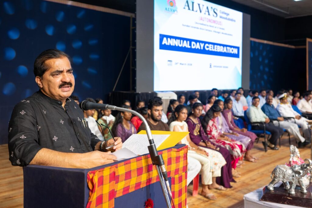 ಕಾರ್ಯಕ್ರಮದ ಅಧ್ಯಕ್ಷತೆ ವಹಿಸಿದ್ದ ಆಳ್ವಾಸ್ ಶಿಕ್ಷಣ ಸಂಸ್ಥೆಯ ಅಧ್ಯಕ್ಷ ಡಾ. ಎಂ ಮೋಹನ್ ಆಳ್ವ, ಬದಲಾಗುತ್ತಿರುವ ಶಿಕ್ಷಣ ವ್ಯವಸ್ಥೆಯಲ್ಲಿ ಸಾಂಪ್ರದಾಯಿಕ ಕೋರ್ಸ್ ಗಳನ್ನು ಬಲಪಡಿಸುವ ಅಗತ್ಯವಿದೆ. ಜಾಗತಿಕ ವಿಶ್ವವಿದ್ಯಾಲಯಗಳೊಂದಿಗೆ ಸ್ಪರ್ಧಿಸಲು ನಾವು ನವೀನತೆ, ಗುಣಮಟ್ಟ ಮತ್ತು ಪ್ರಸ್ತುತತೆಯನ್ನು ಕಾಪಾಡಿಕೊಳ್ಳಬೇಕು. ಕಾಲದ ಬದಲಾವಣೆಗಳಿಗೆ ಹೊಂದಿಕೊಳ್ಳುವ ಶಿಕ್ಷಣವೇ ವಿದ್ಯಾರ್ಥಿಗಳ ಭವಿಷ್ಯವನ್ನು ಬಲಪಡಿಸಿ ದೇಶದ ಅಭಿವೃದ್ಧಿಗೆ ಕೊಡುಗೆ ನೀಡಬಲ್ಲದು ಎಂದರು. ಆಳ್ವಾಸ್ ಸಂಸ್ಥೆ ಪ್ರತಿ ವರ್ಷ ಸುಮಾರು ರೂ. 60 ಕೋಟಿಯಷ್ಟು ಹಣವನ್ನು ವಿದ್ಯಾರ್ಥಿಗಳ ಉಚಿತ ಶಿಕ್ಷಣಕ್ಕೆ ವ್ಯಯಿಸುತ್ತಿದೆ. ಮಂಗಳೂರು ವಿವಿಯ ಅಂತರ್ಕಾಲೇಜು ಅಥ್ಲೆಟಿಕ್ಸ್ ಸ್ಪರ್ಧೆಗಳಲ್ಲಿ ದಾಖಲಾದ ಎಲ್ಲಾ 47 ಕೂಟ ದಾಖಲೆಗಳು ಆಳ್ವಾಸ್ ಕಾಲೇಜಿನ ಹೆಸರಿನಲ್ಲಿದೆ ಎಂದರು. ಶೈಕ್ಷಣಿಕ, ಕ್ರೀಡಾ ಹಾಗೂ ಸಾಂಸ್ಕೃತಿಕ ಕ್ಷೇತ್ರಗಳಲ್ಲಿ ಸಾಧನೆ ಮಾಡಿದ ವಿದ್ಯಾರ್ಥಿಗಳನ್ನು ಕಾರ್ಯಕ್ರಮದಲ್ಲಿ ಸನ್ಮಾನಿಸಲಾಯಿತು. ನಂತರ ವಿದ್ಯಾರ್ಥಿಗಳಿಂದ ವೈವಿಧ್ಯಮಯ ಸಾಂಸ್ಕೃತಿಕ ಕಾರ್ಯಕ್ರಮಗಳು ಜರುಗಿತು. ಆಳ್ವಾಸ್ ಟ್ರಸ್ಟಿ ವಿವೇಕ್ ಆಳ್ವ, ಆಳ್ವಾಸ್ ಕಾಲೇಜಿನ ಪ್ರಾಂಶುಪಾಲ ಡಾ| ಕುರಿಯನ್, ಪರೀಕ್ಷಾಂಗ ವಿಭಾಗದ ಕುಲಸಚಿವ ಡಾ| ನಾರಾಯಣ ಶೆಟ್ಟಿ, ಶೈಕ್ಷಣಿಕ ಕುಲಸಚಿವ ಡಾ| ಟಿ.ಕೆ ರವೀಂದ್ರನ್, ಆಡಳಿತಾಧಿಕಾರಿ ಬಾಲಕೃಷ್ಣ ಶೆಟ್ಟಿ, ಮಾನವಿಕ ವಿಭಾಗದ ಡೀನ್ ಸಂಧ್ಯಾ ಕೆ.ಎಸ್ ಸೇರಿದಂತೆ ಇತರರು ಉಪಸ್ಥಿತರಿದ್ದರು. ಪ್ರೆಶಲ್ ಡಿ ಆಲ್ಮೇಡಾ ನಿರೂಪಿಸಿ, ಶಿಖಾ ಸ್ವಾಗತಿಸಿ, ಮಿಯಾ ಕೆನಡಿ ವಂದಿಸಿದರು.