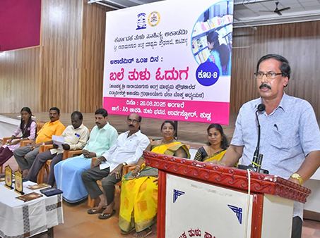 ವಿದ್ಯಾರ್ಥಿಗಳಿಗೆ ತುಳು ಸಾಹಿತ್ಯದ ಓದಿನ ಅಭಿರುಚಿ ಮೂಡಿಸುವುದು ಇಂದಿನ ಅಗತ್ಯವಾಗಿದೆ ಎಂದು ಸಾಹಿತಿ ಹಾಗೂ ನಿವೃತ್ತ ಶಿಕ್ಷಕ ನಾರಾಯಣ ರೈ ಕುಕ್ಕುವಳ್ಳಿ ಹೇಳಿದರು. ಕರ್ನಾಟಕ ತುಳು ಸಾಹಿತ್ಯ ಅಕಾಡೆಮಿಯು ಶ್ರೀ ನಾರಾಯಣಗುರು ಆಂಗ್ಲ ಮಾಧ್ಯಮ ಪ್ರೌಢಶಾಲಾ ವಿದ್ಯಾರ್ಥಿಗಳಿಗಾಗಿ ಆಯೋಜಿಸಿದ ‘ಅಕಾಡೆಮಿಡ್ ಒಂಜಿ ದಿನ ಬಲೆ ತುಳು ಓದುಗ’ ಅಭಿಯಾನದ ಎಂಟನೇ ಕೂಟವನ್ನು ಉದ್ಘಾಟಿಸಿ ಅವರು ಮಾತನಾಡಿದರು. ಮುಂದಿನ ತಲೆಮಾರಿಗೆ ತುಳು ಭಾಷೆಯನ್ನು ಕೊಂಡೊಯ್ಯುವ ಮಹತ್ತರ ಜವಾಬ್ದಾರಿ ವಿದ್ಯಾರ್ಥಿಗಳಲ್ಲಿದೆ ಎಂದು ಅವರು ಹೇಳಿದರು. ಕಾರ್ಯಕ್ರಮದಲ್ಲಿ ಮುಖ್ಯ ಅತಿಥಿಯಾಗಿ ಪಾಲ್ಗೊಂಡ ಬ್ರಹ್ಮಶ್ರೀ ನಾರಾಯಣ ಗುರು ಶಿಕ್ಷಣ ಸಂಸ್ಥೆಯ ಅಧ್ಯಕ್ಷರಾದ ಪಿ. ದಯಾಕರ್ ಅವರು ಮಾತನಾಡಿ, ತುಳು ಭಾಷೆ, ಸಾಹಿತ್ಯದ ಸಂಸ್ಕ್ರತಿ ಬಗ್ಗೆ ಅಭಿರುಚಿ ಮೂಡಿಸುವ ನಿಟ್ಟಿನಲ್ಲಿ ‘ಅಕಾಡೆಮಿಡ್ ಒಂಜಿ ದಿನ ಬಲೆ ತುಳು ಓದುಗ’ ಕಾರ್ಯಕ್ರಮ ಒಂದು ವಿಶಿಷ್ಟ ಪರಿಕಲ್ಪನೆಯ ಕಾರ್ಯಕ್ರಮ ಎಂದು ಹೇಳಿದರು. ಕಾರ್ಯಕ್ರಮದ ಅಧ್ಯಕ್ಷತೆ ವಹಿಸಿದ ಕರ್ನಾಟಕ ತುಳು ಸಾಹಿತ್ಯ ಅಕಾಡೆಮಿ ಅಧ್ಯಕ್ಷ ತಾರಾನಾಥ್ ಗಟ್ಟಿ ಕಾಪಿಕಾಡ್ ಅವರು ಮಾತನಾಡಿ, ತುಳು…