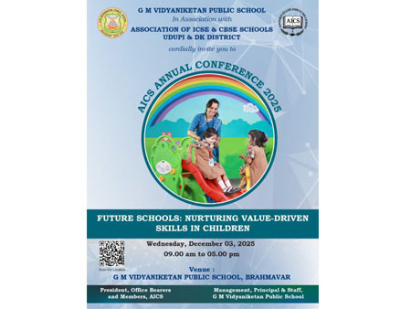 ಬ್ರಹ್ಮಾವರ: ಇಲ್ಲಿನ ಜಿ ಎಮ್ ವಿದ್ಯಾನಿಕೇತನ್ ಪಬ್ಲಿಕ್ ಸ್ಕೂಲ್ನಲ್ಲಿ ಡಿ. ೩ ರಂದು ಉಡುಪಿ ಹಾಗೂ ಮಂಗಳೂರು ಜಿಲ್ಲೆಗಳ ವಿವಿಧ ಸಿಬಿಎಸ್ಇ ಮತ್ತು ಐಸಿಎಸ್ಇ ಶಾಲೆಗಳ ಪ್ರಾಂಶುಪಾಲರಿಗೆ…
